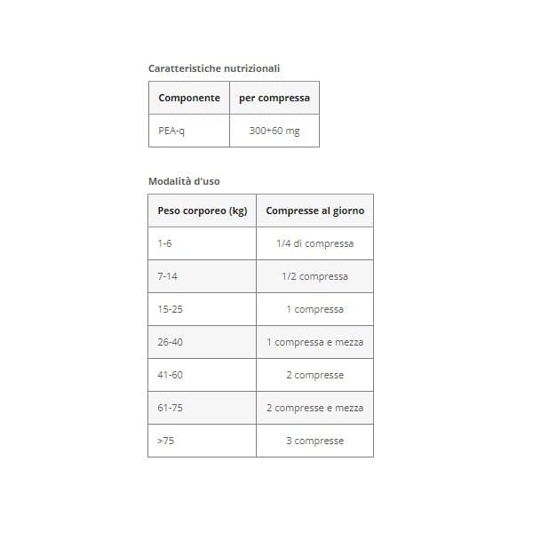 Proprietà: la PEA (palmitoiletanolamide) è una sostanza naturale presente in molte fonti alimentari di origine sia animale che vegetale (es. soia). Nell’organismo animale funge da biomodulatore endogeno per il mantenimento dell’equilibrio fisiologico di molti organi e tessuti (es. sistema nervoso). La co-ultramicronizzazione con la quercetina (bioflavonoide con spiccata attivitàù antiossidante) migliora la biodisponibilità della PEA e fornisce una naturale protezione contro lo stress ossidativo.