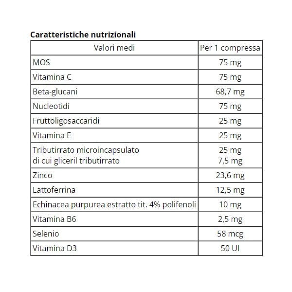 Con beta-glucani da Lievito di birra, zinco, MOS-mannanoligosaccaridi, nucleotidi, selenio, estratto di echinacea purpurea e vitamine B6, C, D, E.